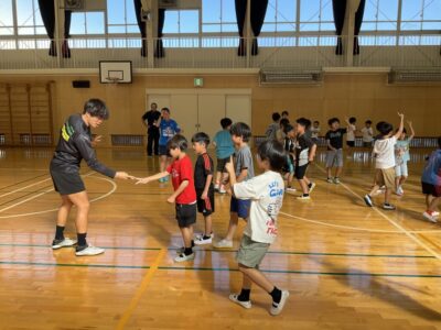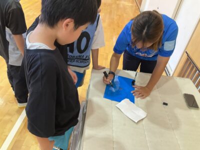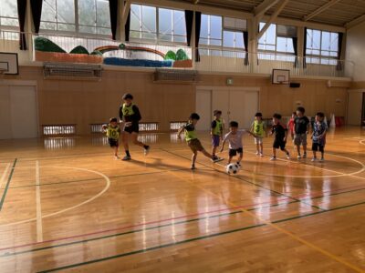 まずはアイスブレイクのじゃんけん大会で緊張をほぐしたあと、3人組に分かれてパス練習を行いました。練習にはチーフも参戦!子どもたちはプロの先生方から直接ボールの扱い方を教わり、上達を見せていました!