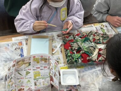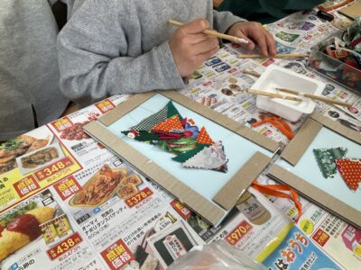 小さく切った布を一枚一枚台紙に貼り合わせていく根気のいる作業ですが、いつも大人気で、皆んなが集中して完成させていました。