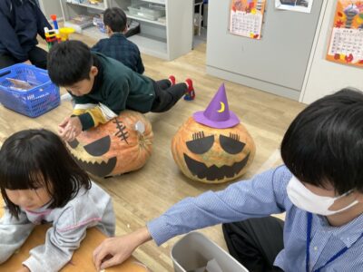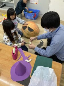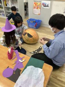 本当は中身をくり抜きたいところですが、中がいたんでしまうので、紙を貼って、Jack-o’Lanternを作ってもらいました。