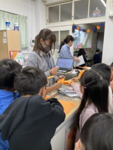 トリックオアトリート!と言ってから、スタンプを押してもらい、3個揃ったら完成です。スタンプを持っているスタッフは入れ替わるので、誰が持っているかわかりません。キッズの会が終わったらスタートです!