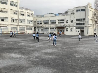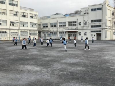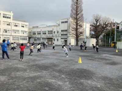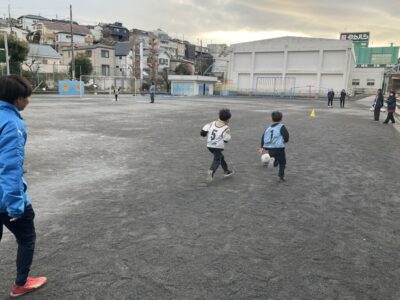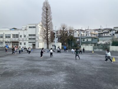 遊びながらトレーニングをしていきます。後ろのビブスを取られないように、みんなが逃げます!