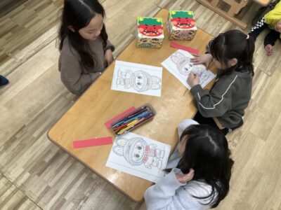節分 2026年02月10日 2月3日に節分イベントは『お面と升作ろう』です。 どの絵にするか悩みますね〜 色を塗って、お面にしていきます。 帰る時に、お豆をもらって節分イベントを楽しみました。 一覧へもどる