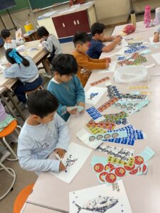 シールをちぎって、貼って、おさかなについて学ぶ。