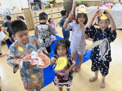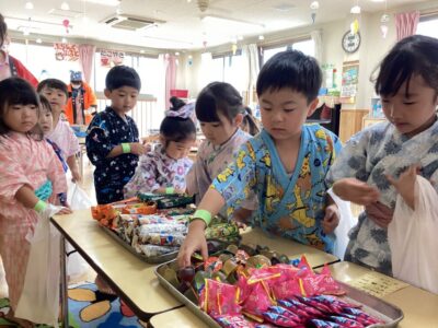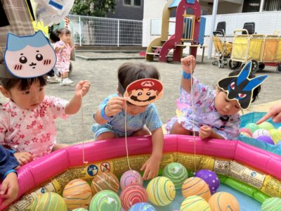 ポケモンやちぃかわ、アンパンマンなどの様々なお面の中から自分の好きなキャラクターのお面を選び、お面を付けながらお祭り気分を楽しみました♡室内では魚釣りや塗り絵を行い、乳児さんはボーリングをして楽しい遊びをたくさん行いました(^^♪