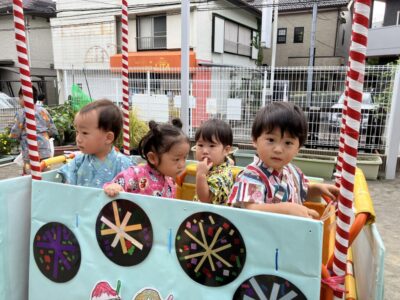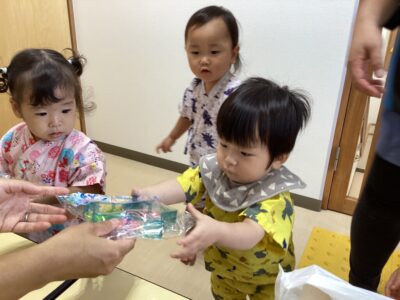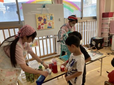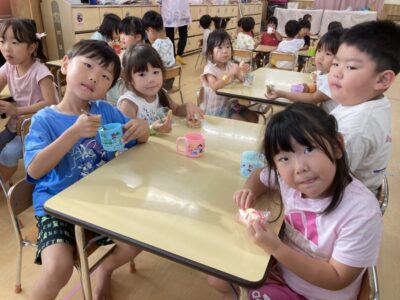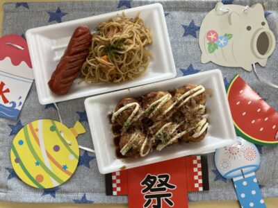 また、みんなが楽しみにしていたご飯には「たこ焼き、焼きそば、フランクフルト」が出ました!「たこ焼き早く食べたいな~」とワクワクしている姿がとても可愛かったです❤おやつには、かき氷も美味しく食べました!!