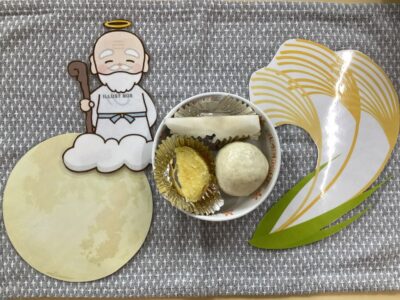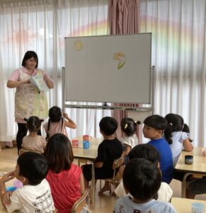 お月見集会ではマグネットシアターを使って月見の由来、秋の果物、月の満ち欠け、日本と海外の月の見え方の違いについてお話ししました。