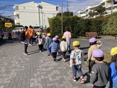 今回の避難訓練ではひよこ組は保育園で遊び中、うさぎ組は公園で遊んでいる時に、地震が発生した想定で訓練を行ないました。