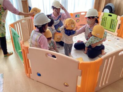 0歳さんはサークル遊び中、1歳さんは芝生で遊んでいる時に地震が発生!