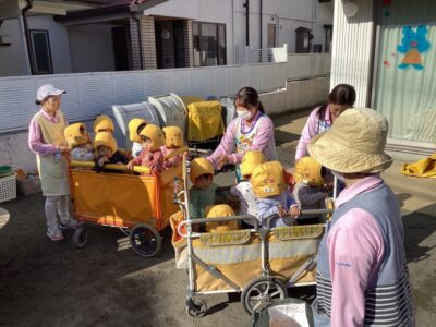 サークル内で集まったり、バギーに乗ったりして避難することが出来ました。防災頭巾も被って避難することが出来ました!