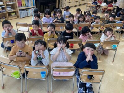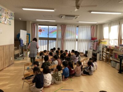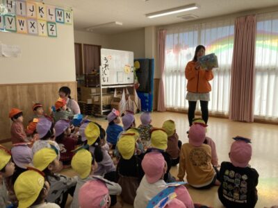 始まる前から鬼が怖くて涙がこぼれてしまうお友だちもいましたが、節分の由来やクイズで少し心を落ち着かせながら参加していました。