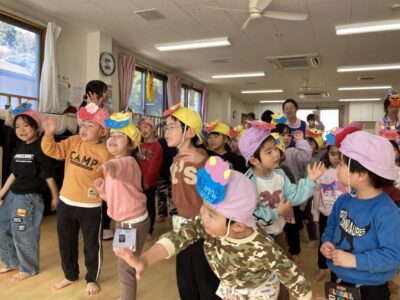 事前に作っていた鬼のお面を帽子に付けて参加しました☆