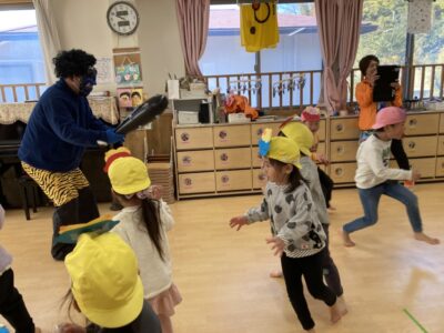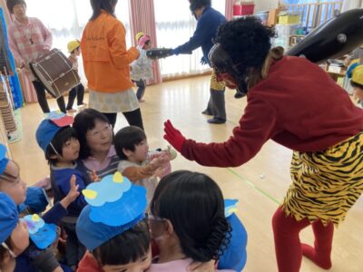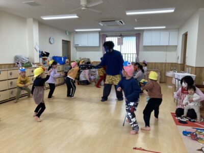 泣きながら保育者の背中に隠れるお友だち、勇敢に豆まきをして退治してくれるお友だち、中には鬼と触れ合うお友だちもいました(^-^)