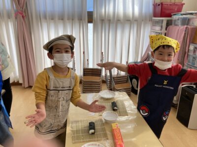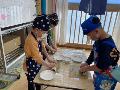給食後、年長さんは調理さんと一緒に自分で恵方巻作りをしました!