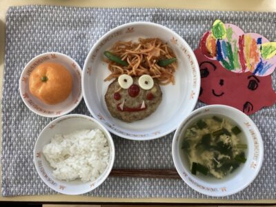 豆まきの後の給食は、節分ハンバーグ!鬼の顔のハンバーグを「可愛い!」「おいしい!」と言いながら美味しそうに食べていました♫