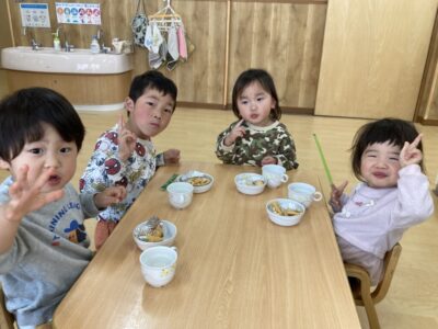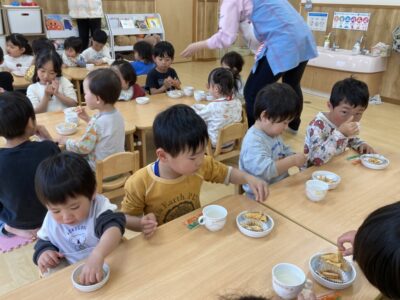 午後のおやつでは年長さんが0,1歳児さんのお世話をしてくれました!