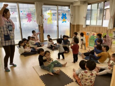 「バスに乗って」「大型バスに乗ってます」に合わせて年長さんのお膝の上でゆらゆら✨腕でしっかり支えてあげ、安全もばっちりでした!