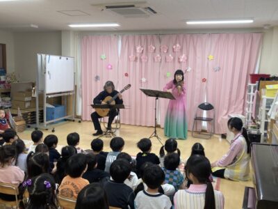 ギターとヴァイオリンの演奏者が来てくれ、「ドラえもん」や「おもちゃのチャチャチャ」、「ミッキーマウスマーチ」など馴染みのある曲を演奏してくれました✨