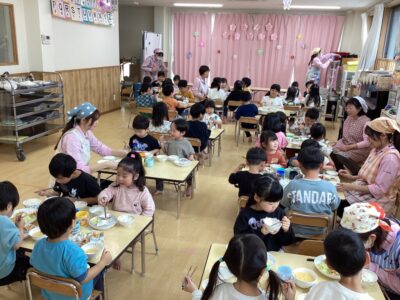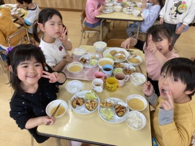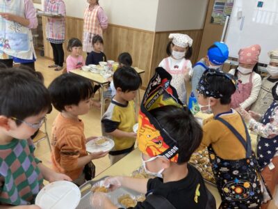 ゲームの後はバイキングで年長さんにおかずを配ってもらいました!