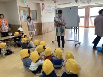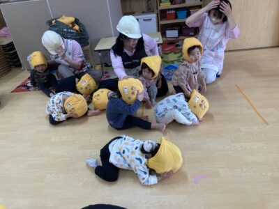 「地震です」と伝えられるとすぐに「ダンゴムシポーズ」を取ることが出来ていました!