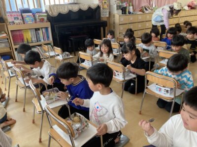 防災頭巾を敷いて座り、椅子をテーブルにして給食を食べました!