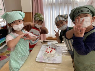 ケーキ作りが上手くいくと「おいしそう~」「できた~」と笑顔で完成を喜んでいました。