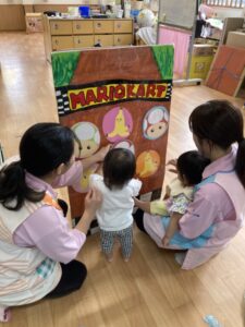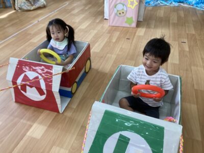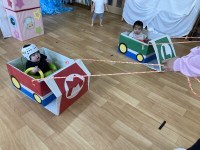 マオリカートに乗って出発進行~!!バンドルを持ち、運転気分の子どもたち。
