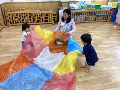 年長さんが行っているパラバルーンを見て、カラーポリ袋で作ったバルーンに挑戦☆彡