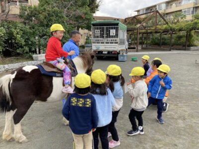 良いお天気の中、動物さんと触れあってきました!職員の方のお話しを聞いてエサやりやポニー乗り体験へ!