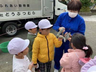 今回はヘビも来てくれて「怖~い!」と話していた子ども達でしたが、触れていくうちに「可愛いかも!」と触れられる時間が長くなり、首にも巻いていました!