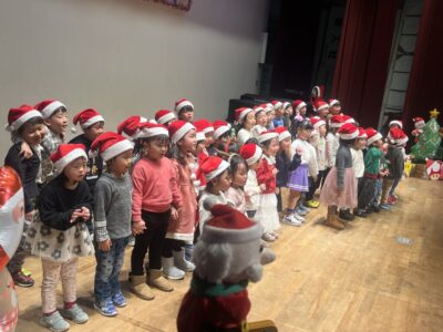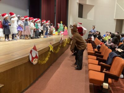 広いホールに集まった子どもたちはサンタ帽を被ったり、可愛い衣装を着たりと始まる前からワクワクした様子でした。