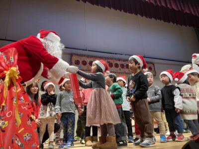 少しドキドキしながら受け取る子、ニコニコ笑顔でサンタさんとタッチする子、「ありがとう」としっかり伝える姿も見られました!