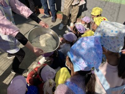 「よいしょ~、よいしょ~」とみんなで声をかけて、おもちが出来ていく様子を見学しました♪