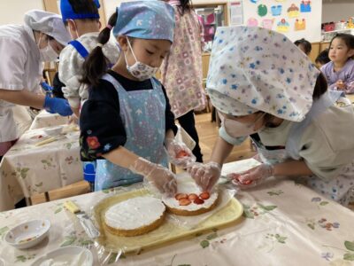 「ここにイチゴ、のせよう」「雪みたいに、真っ白に塗ろう」と、楽しそうにお話ししながら作っています(^^♪